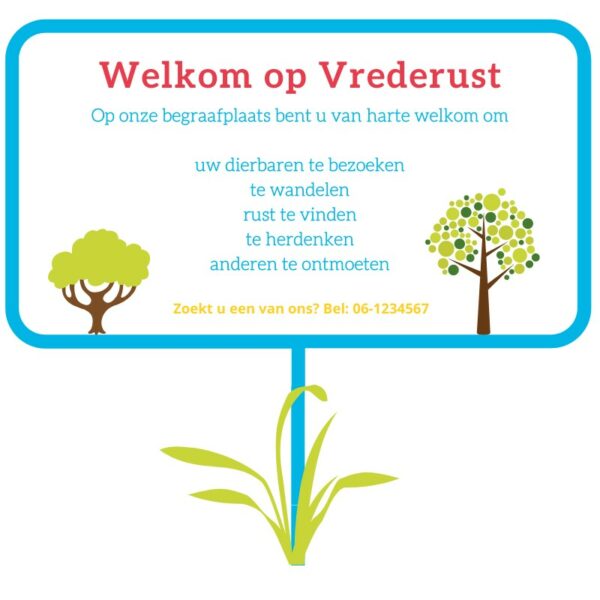 Bij de meeste begraafplaatsen hangt bij de entree minstens één verbodsbord. Daarop staat wat er allemaal niet mag (fietsen, rondlopen met een hond, er als minderjarige rondlopen zonder begeleiding door een meerderjarige, voor zonsopgang of na zonsondergang aanwezig zijn, et cetera). Dat voelt niet echt welkom. Wat zou het mooi zijn als er een vriendelijk welkomstbord zou hangen. In ons rapport doen we een voorstel.